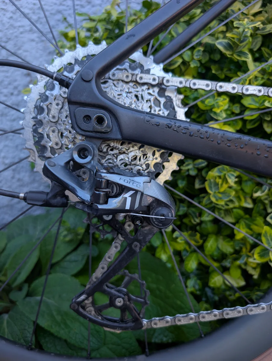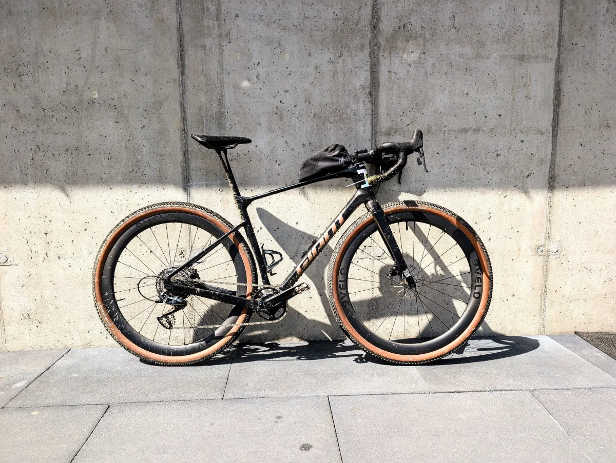 frame: Giant Revolt Advanced drivetrain: shifters: modified Sram Red 1x to handle 13 shifts rear: Sram Force 1x mechanical cassette: Sram Force 10-33 12s + 40t sprocket = 13 speeds total cranks: new Sram Force AXS with quark powermeter and 38 oval chainring wheels: rims 9Velo 26mm internal 45mm deep :) tires: G-One R Pro 50mm (quite fast according to bicyclerollingresistance) setapost: aliexpress canyon/ergon like carbon seatpost saddle: Fizik handlebar: 40mm carbon