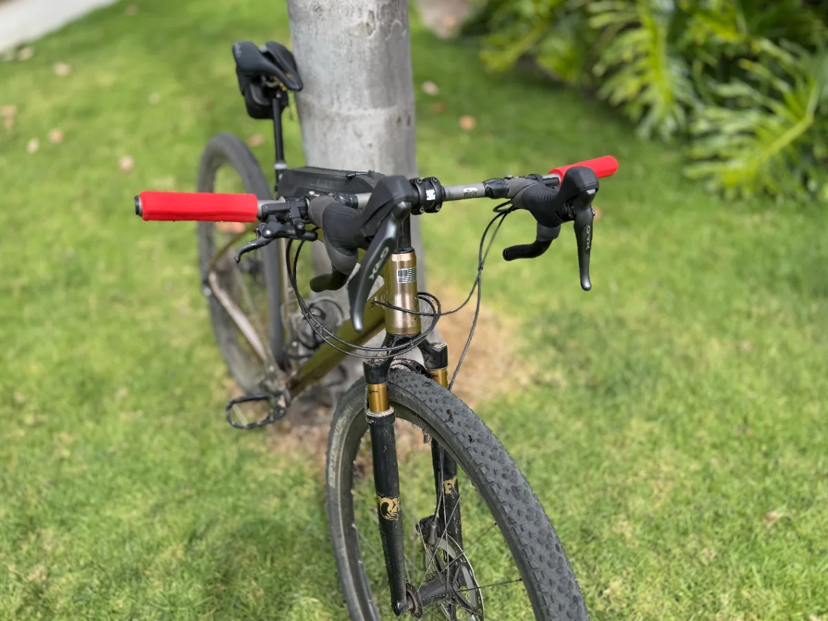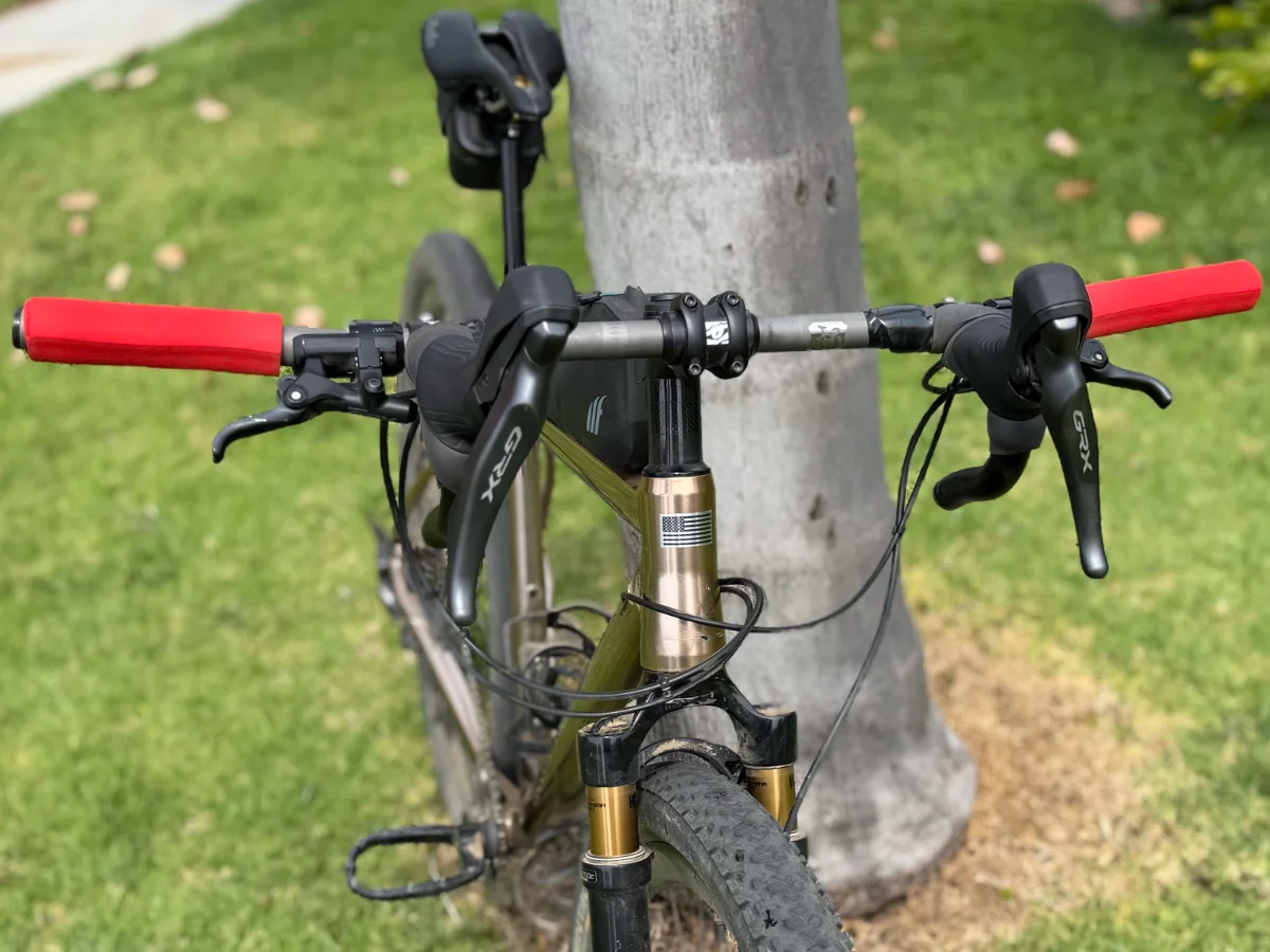 Stormchaser with drop bars and flat bars - you can have both! GRX 820 with GRX RX-812's mounted inside-out so that both flats and drops have brakes Custom titanium handlebar with adapters to mount the control setup 54.5cm frame, chainstays set to 450mm for telepathic steering Rotor 160mm cranks with 36T oval and MTB PM Pendulum pedals (as a means to make effective stack higher) 2.2 Race King in front, 2.35 G-One Speed Pro in rear PNW Rainer dropper, actuated by left shifter Fox 32 TC w/ Grip SL