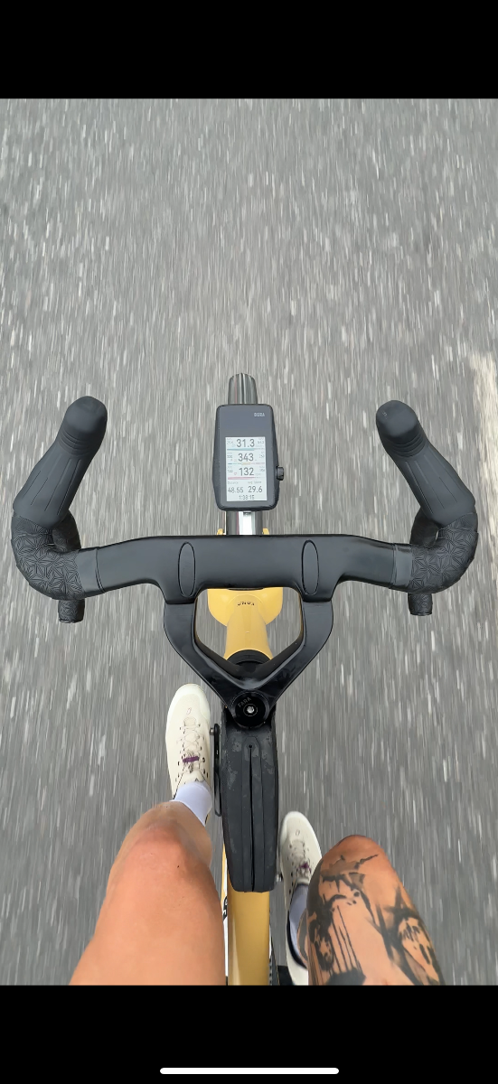 Fara F/Gravel size 59 Fulcrum Sharq wheels (62 mm depth, 25 mm internal / 30 mm external) Thunder Burt tires: 2.25 front (54 mm) and 2.1 rear (52 mm) SRAM AXS Force E1 drivetrain with GX Eagle, Novaride OSPW and 48T x 10–52 gearing Fara modular cockpit 400 mm x 120/130 mm (prototype) Enve 27.2 seatpost, Fizik Vento Argo R3 Adaptive saddle. Apidura aero bag system (drilled hole in the bags to use screw mounts) Favero Assioma MX pedals Coros Dura computer. Total weight: 9.5 kg