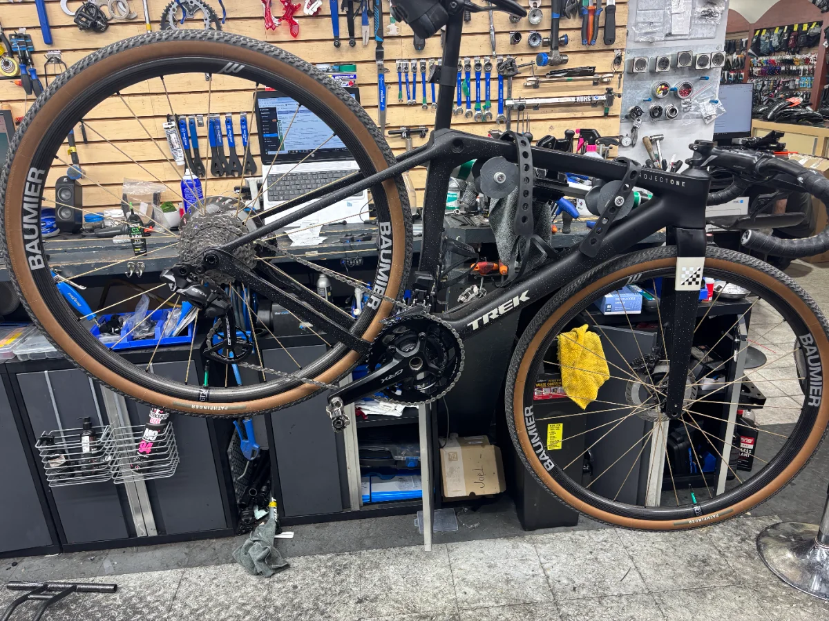 Trek Checkmate custom build. I am a visualy impared gravel privateer racing this bike with a guide. Raced Unbound 2025 and going to SeaOtter, Unbound, Leadville and more :) Comes in at 7.6kg with cages and pedals. Size: Small Shifters: Shimano GRX Barstem: CRW 130mm/36cm RD, cassette, chain: Shimano GRX Chainring: Shimano GRX Saddle: Selle Italia SLR boost Carbon Wheels: Baumier GT24 Ultralight (1129g) - PiRope spokes Tires: Pathfinder 45 Pedals: Favero Assioma MX-2 BB, HS : CeramicSpeed