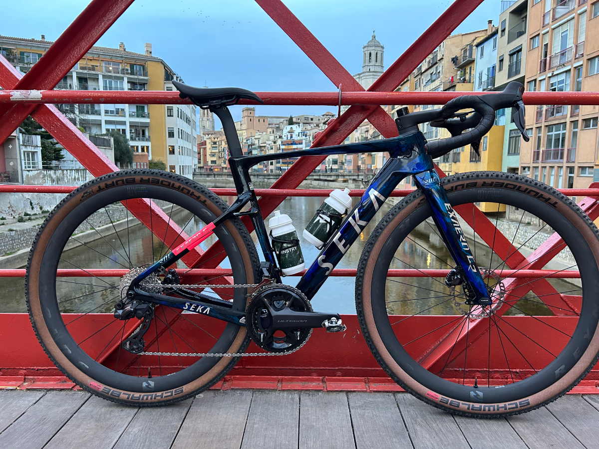 In the previous episode, you guys rated a Seka Spear road bike. Here is my Seka EXAERO GR gravel bike. For this season, I am sponsored by the brand and will be racing the Traka360 and Unbound, among others, with this bike. I have already raced Santa Vall with this bike. The brand makes super reliable bikes. The gravel bike is one of the best on the market right now. It can fit 2.1 T-burts in the back and 2.25 in the front. Besides the clearance it’ss aero, stiff, and lightweight.